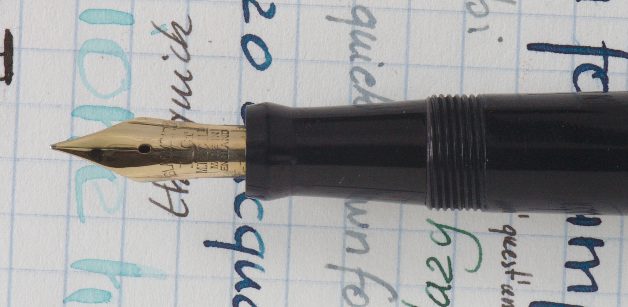 Foto di una penna Blackbird (sottomarca Swan). Modello: Blackbird Self-Filler. Caricamento a levetta. Realizzazione in celluloide nera. Dettaglio del pennino. Modello specifico di denominazione ignota.