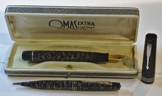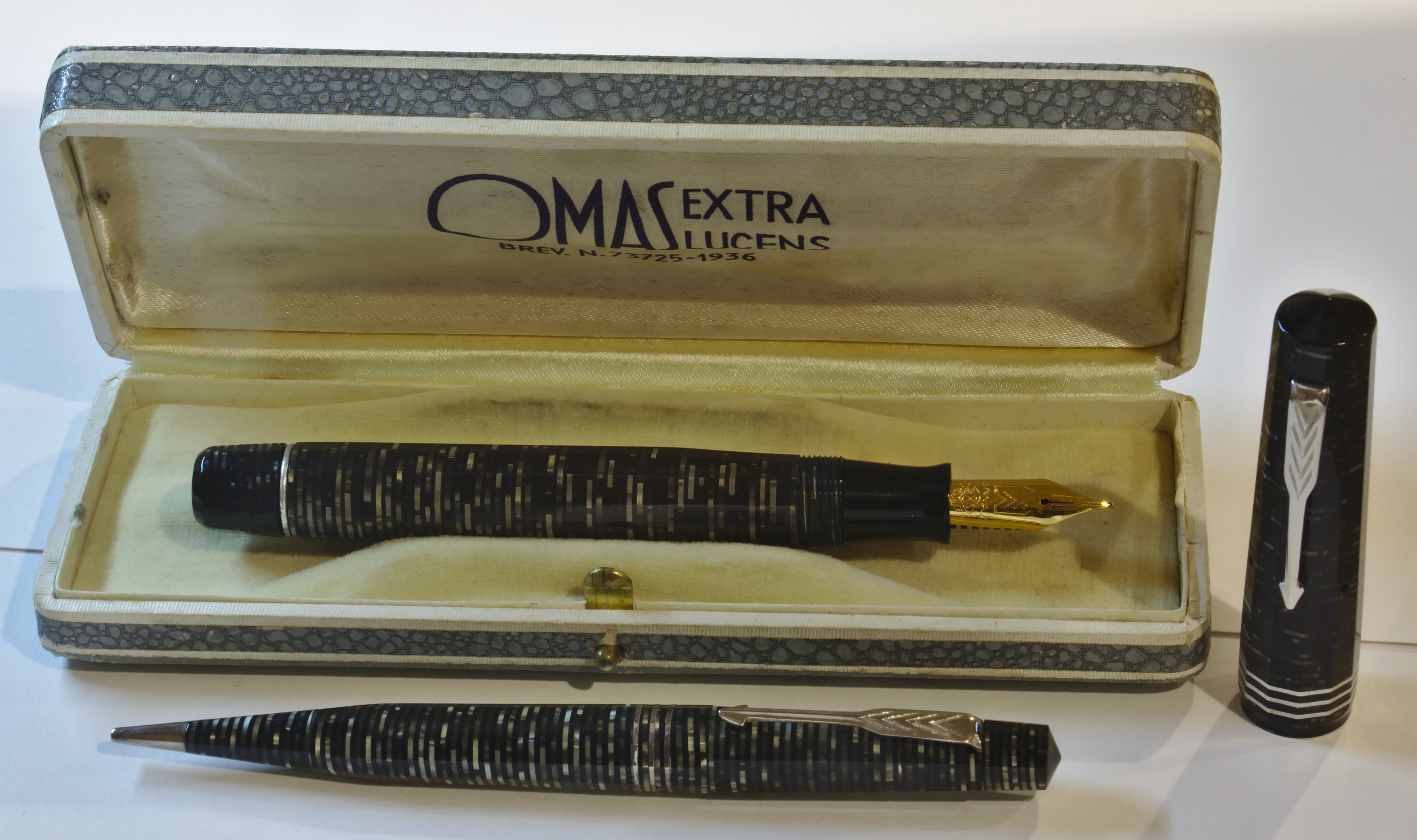 Photo of a pen/pencil set produced by Omas. Model: Extra Lucens. Filling system: "stantuffo tuffante". In ringed gray celluloid. Big size. Three rings version, with white finish. There is the imprint of nº IT-73725-1936 patent. Courtesy of Letizia Jacopini. Photographed at 2019 Bruxelles Pen Show.