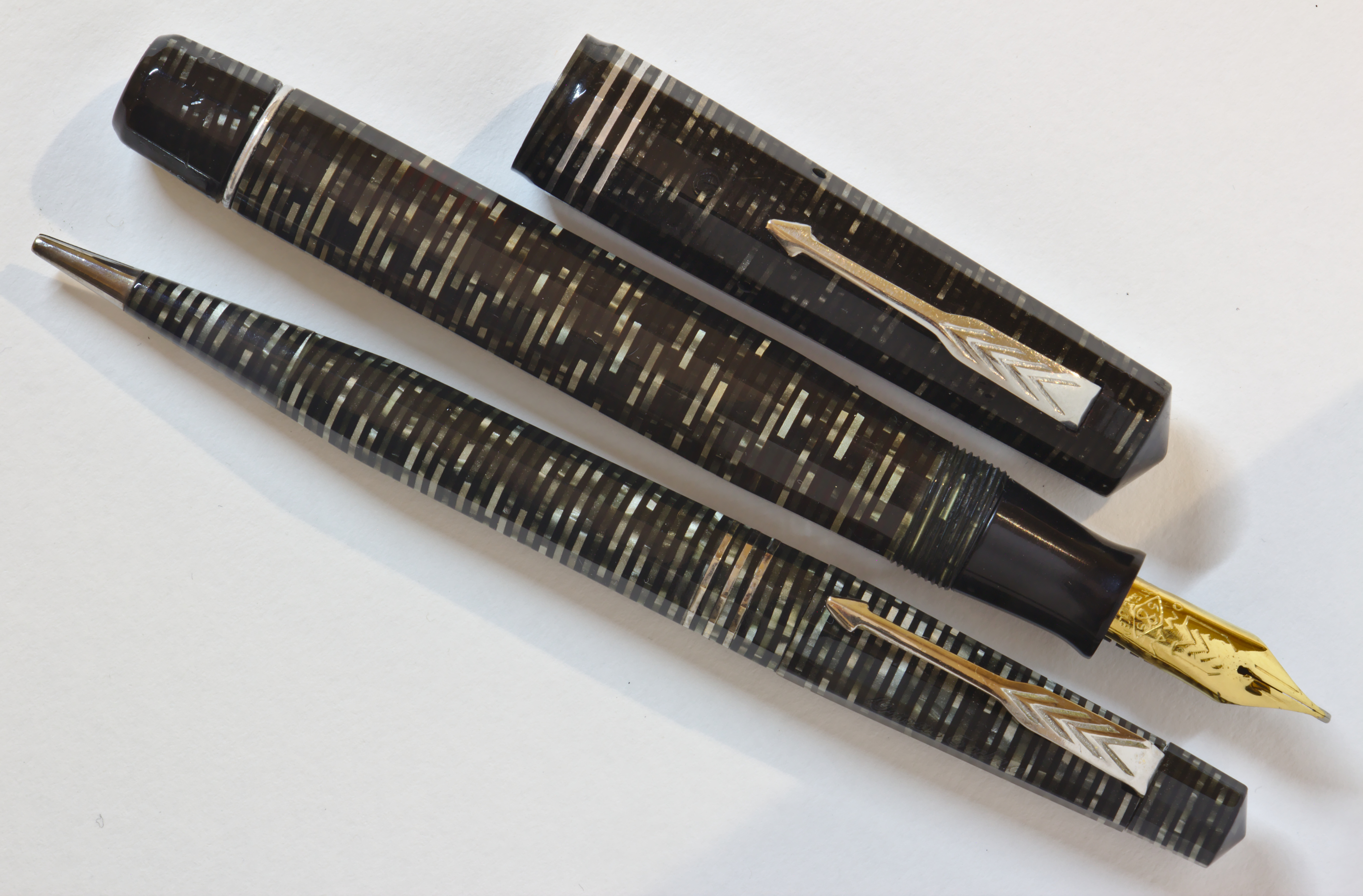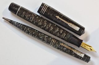 Photo of a pen/pencil set produced by Omas. Model: Extra Lucens. Filling system: "stantuffo tuffante". In ringed gray celluloid. Big size. Three rings version, with white finish. There is the imprint of nº IT-73725-1936 patent. Courtesy of Letizia Jacopini. Photographed at 2019 Bruxelles Pen Show.