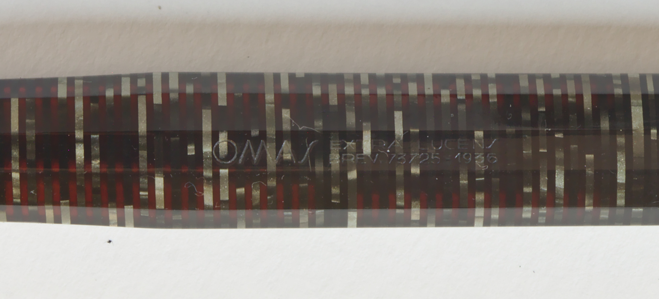 Foto di una combinazione penna/matita meccanica Omas. Modello: Extra Lucens. Caricamento a stantuffo tuffante. Realizzazione in celluloide anellata grigia. Dettaglio della stampigliatura. Misura grande. Versione con tre anellini, finiture bianche. Riporta stampigliato il brevetto nº IT-73725-1936. Messa a disposizione da Letizia Jacopini. Fotografata al Pen Show di Bruxelles del 2019.