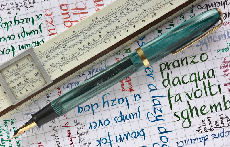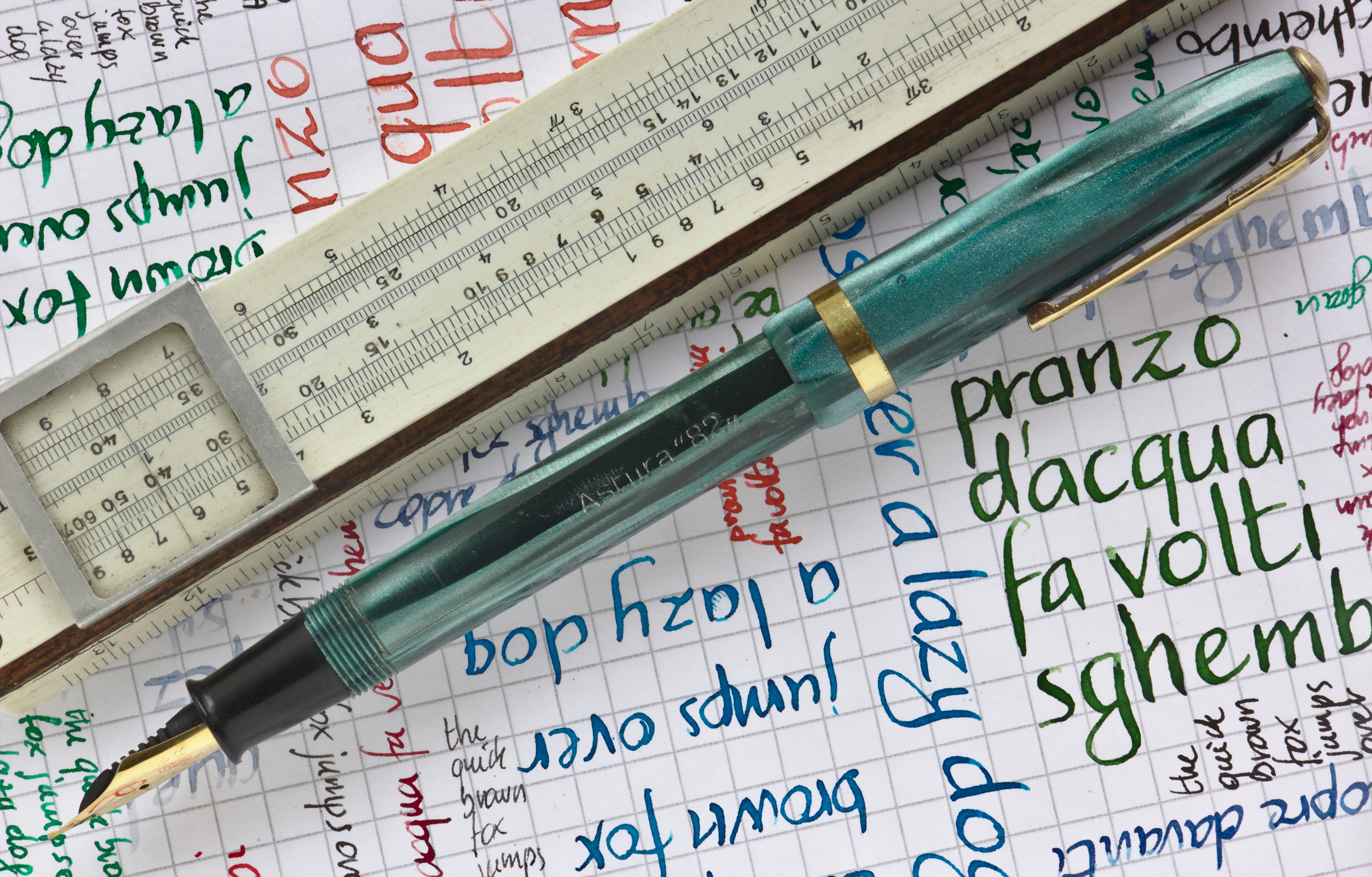 Foto di una penna Astura (sottomarca Società Anonima Fabbrica Italiana Stilografiche). Modello: Astura 82. Caricamento a pulsante di fondo. Realizzazione in celluloide striata celeste. Pennino non originale.