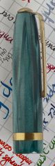 Foto di una penna Astura (sottomarca Società Anonima Fabbrica Italiana Stilografiche). Modello: Astura 82. Caricamento a pulsante di fondo. Realizzazione in celluloide striata celeste. Dettaglio del cappuccio. Pennino non originale.