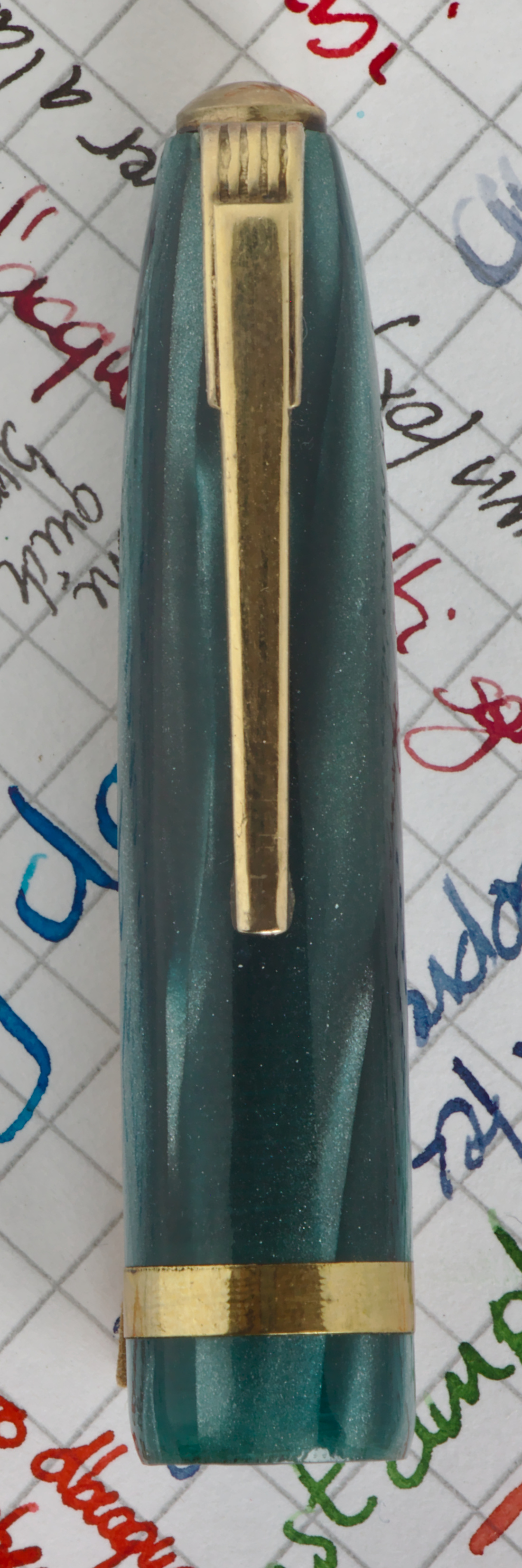 Foto di una penna Astura (sottomarca Società Anonima Fabbrica Italiana Stilografiche). Modello: Astura 82. Caricamento a pulsante di fondo. Realizzazione in celluloide striata celeste. Dettaglio del cappuccio. Pennino non originale.