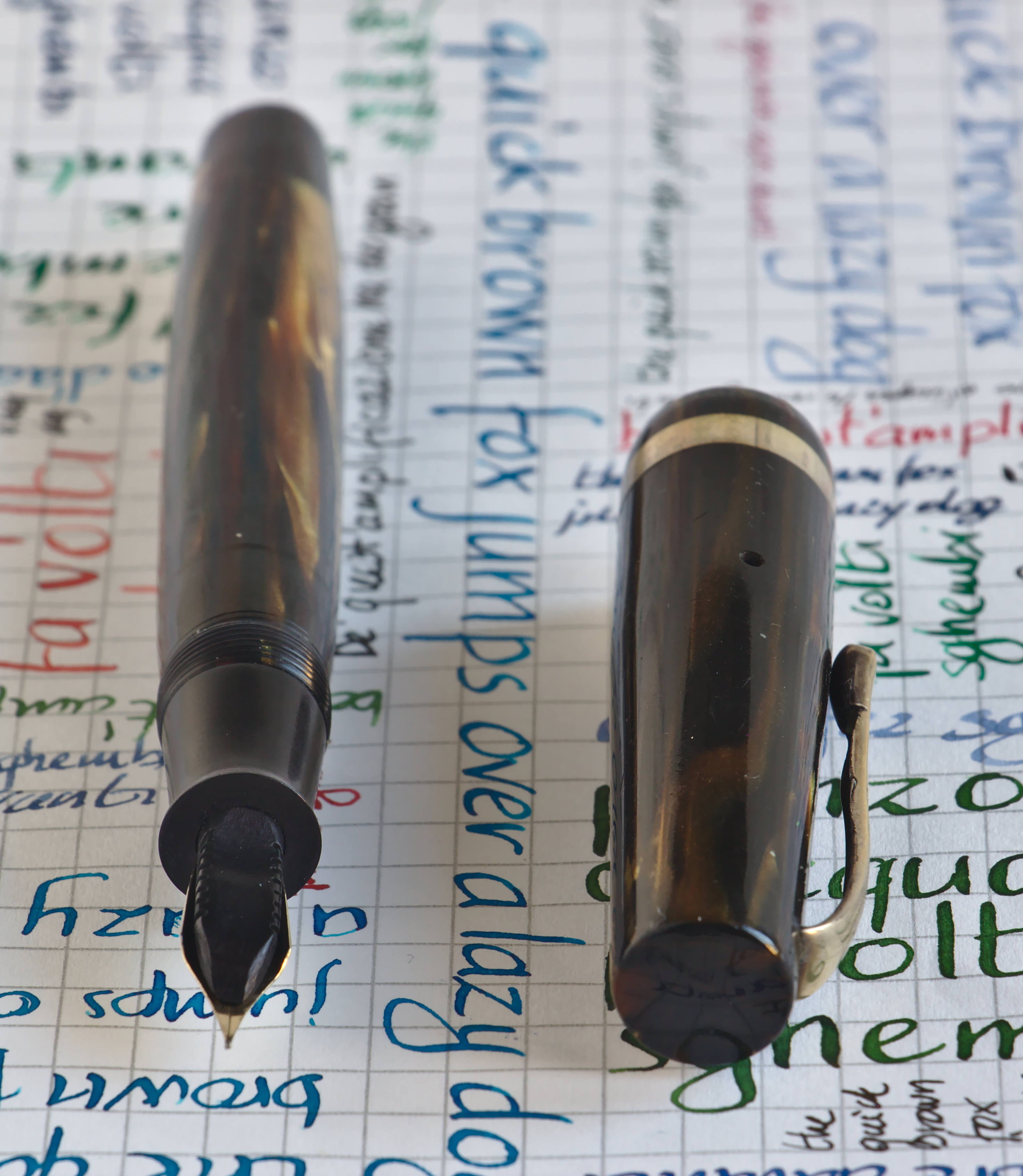 Foto di una penna Morans. Caricamento a pulsante di fondo. Realizzazione in celluloide striata marrone. Pennino n. 8 dorato.