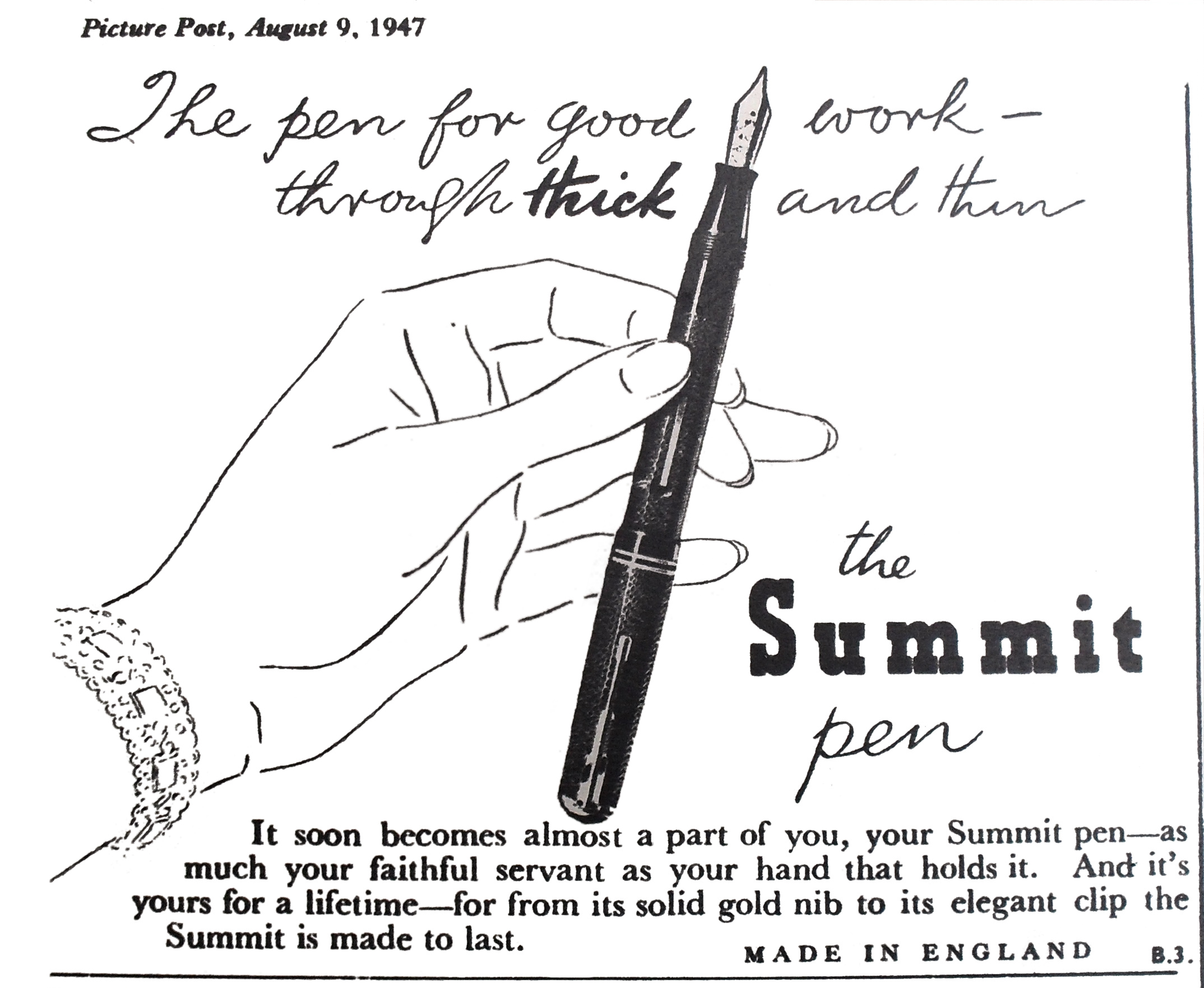 Scansione di una pubblicità Summit (un marchio della Lang - Curzon - Summit) datata 1947-08-09. Pubblicazione su: Picture Post. Contributo di Alberto (utente forum A Casirati). Data visibile direttamente. Pubblicizza una Summit S.175, prima versione (mk 1).