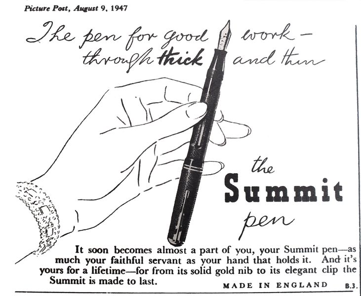 Scanning of advertising from Summit (a Lang - Curzon - Summit trademark) dated 1947-08-09. Published on: Picture Post. Date directly visible. Advertising for a Summit S.175 first version (mk 1).
