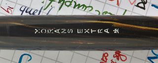 Photo of a pen produced by Morans. Filling system: button filler. In striated brown celluloid. Detail of inscription. Plated n.8 nib.