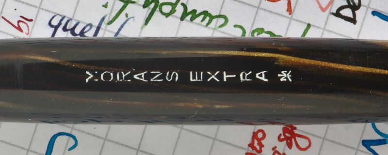 Foto di una penna Morans. Caricamento a pulsante di fondo. Realizzazione in celluloide striata marrone. Dettaglio della stampigliatura. Pennino n. 8 dorato.