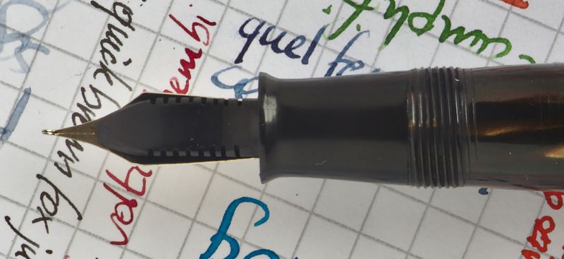 Foto di una penna Morans. Caricamento a pulsante di fondo. Realizzazione in celluloide striata marrone. Dettaglio dell'alimentatore. Pennino n. 8 dorato.