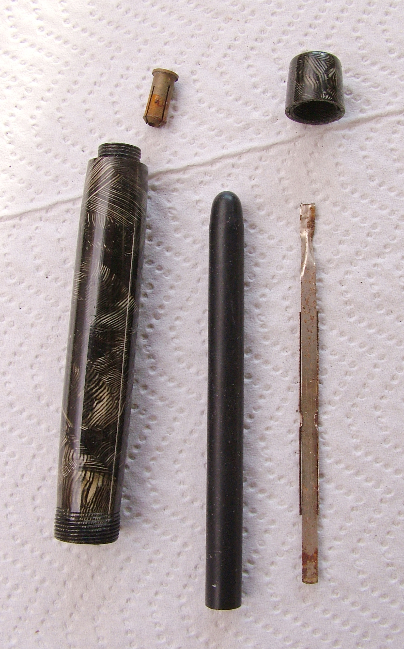 Foto di una penna Aurora. Modello: Selene. Caricamento a pulsante di fondo. Realizzazione in celluloide grigia a striscioline sottili. Dettaglio del caricamento. Prima serie. Caricamento smontato nelle sue parti. Contributo di Massimo (utente forum maxpop55).