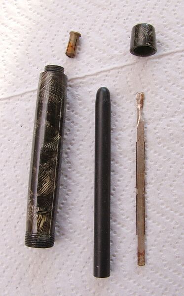 Photo of a pen produced by Aurora. Model: Selene. Filling system: button filler. In short gray strip (webbed) celluloid. Detail of filling system. First version. Filling mechanism dismantled in its parts.