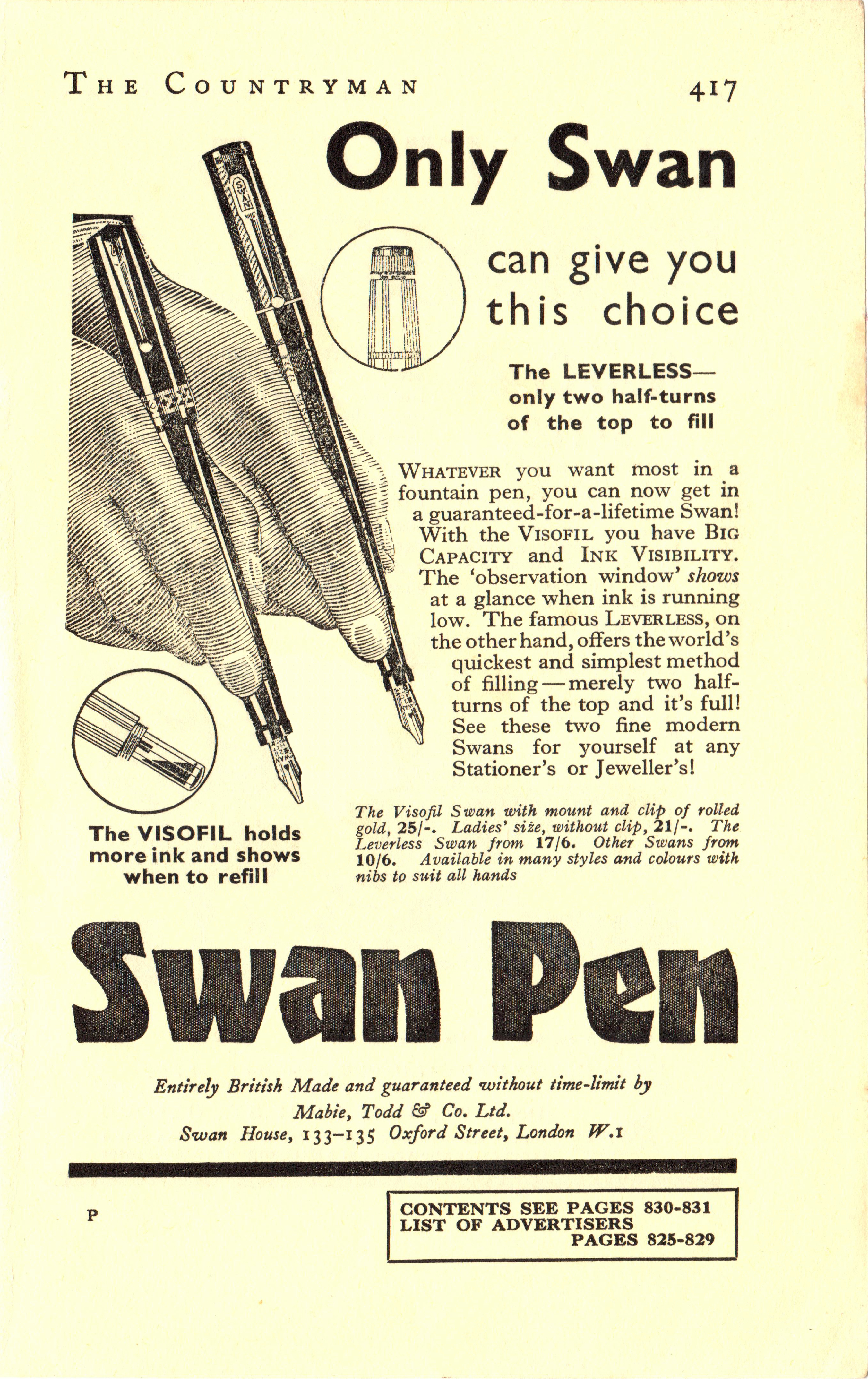 Scansione di una pubblicità Swan datata 1936. Pubblicazione su: The Countryman. Indica come indirizzo: "Swan House, 133/135, Oxford Street, London". Ritoccata dall'autore per una migliore nitidezza. Data indicata dal fornitore. Pubblicizza i modelli Leverless e Visofil.