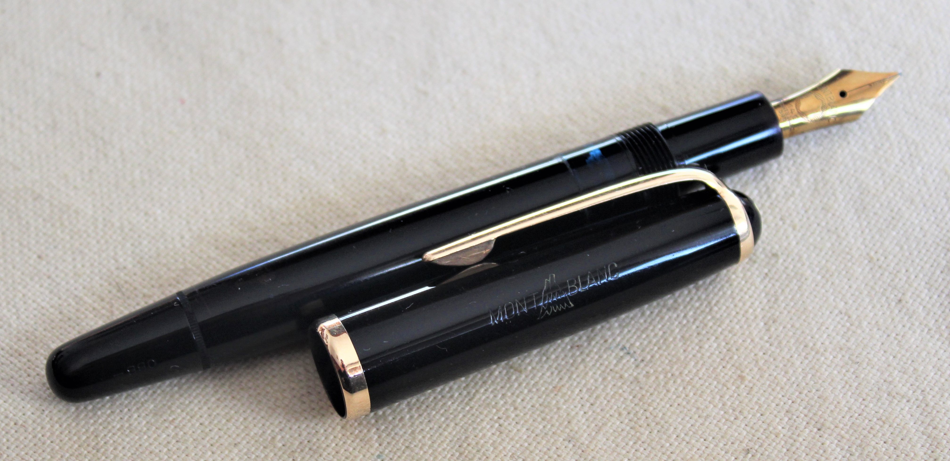Photo of a pen produced by Montblanc. Model: Montblanc 264. Filling system: piston filler. In black plastic. First version with single band and cap imprint.