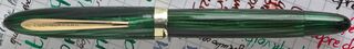 Foto di una penna Montegrappa. Modello: Montegrappa 308. Caricamento a pulsante di fondo. Realizzazione in celluloide a striscie verdi. Versione con marchio MG sul cappuccio.