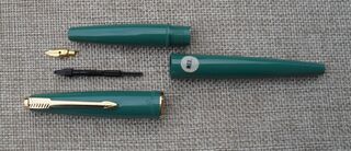 Photo of a pen produced by Parker. Model: Parker 19. Filling system: cartridge filler. In green plastic resin. Golden accent.