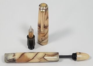 Photo of a pen produced by Opal. An eyedropper filler. In red veined pearl celluloid. Unknown model.