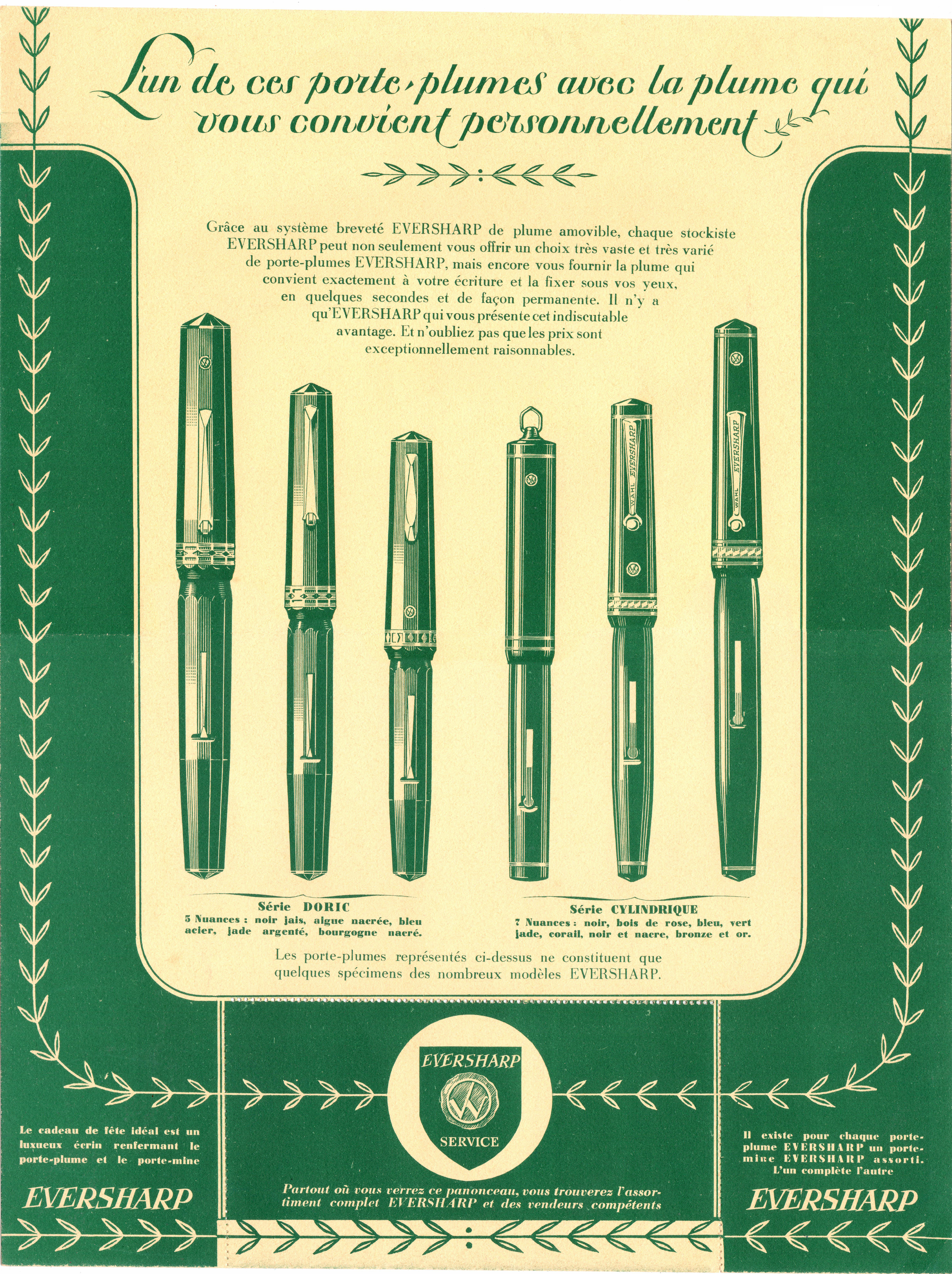 Scansione di una pubblicità Eversharp datata 1933. Ritoccata dall'autore per una migliore nitidezza. Data indicativa, sta per la prima metà degli anni '30, dai modelli pubblicizzati. Pubblicizza i modelli Doric qualificati come Série Doric, ed Equipoised e Gold Seal Personal Point qualificati come Série Cylindrique. Template:SulRetro:193x-Wahl-Doric-Equipoised-Back.jpg.