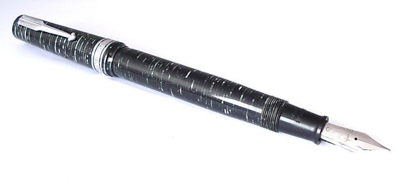 Foto di una penna Columbus. Modello: Columbus Extra N. 98. Caricamento a cucchiaio. Realizzazione in celluloide anellata grigio-verde. Versione tarda con clip a freccia e linee stile Doric. Contributo di Fabio (utente forum fountainpen.it fabbale09).