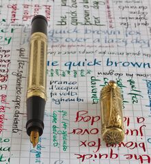 Photo of a pen produced by Invicta. Filling system: safety. With with alternating of waved and smooth panels and chiseled rings gold rolled overlay. "WARRANTED" "14 CT" "1ST QUALITY" nib, gilding marked 18 "K.R." on the cap lip.