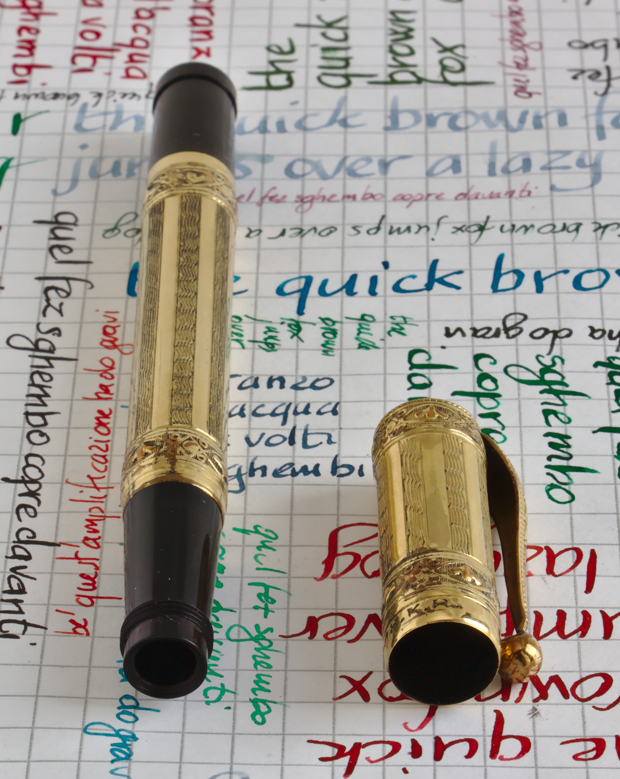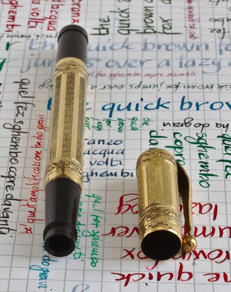 Photo of a pen produced by Invicta. Filling system: safety. With with alternating of waved and smooth panels and chiseled rings gold rolled overlay. "WARRANTED" "14 CT" "1ST QUALITY" nib, gilding marked 18 "K.R." on the cap lip.
