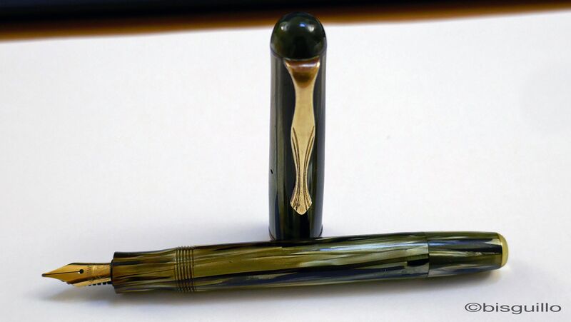 Photo of a pen produced by Compaktor. Filling system: vacumatic-like. In striated brown celluloid. Pen mared Compaktor ref. 493-f Tuffi. Peculiar filler.