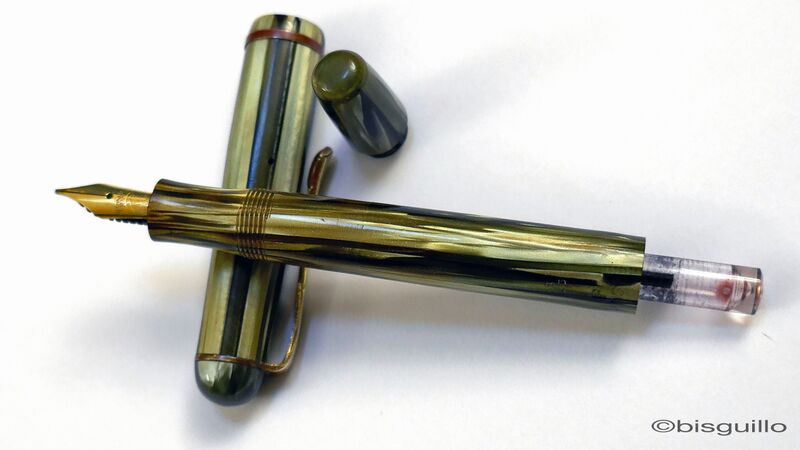 Photo of a pen produced by Compaktor. Filling system: vacumatic-like. In striated brown celluloid. Pen mared Compaktor ref. 493-f Tuffi. Peculiar filler.