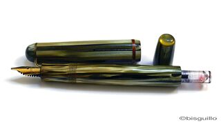 Photo of a pen produced by Compaktor. Filling system: vacumatic-like. In striated brown celluloid. Pen mared Compaktor ref. 493-f Tuffi. Peculiar filler.