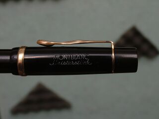 Photo of a pen produced by Montblanc marked "Meisterstück". Model: Montblanc 134. Filling system: piston filler. In black celluloid. Detail of cap. Detail of inscription. Standard wartime version with steel nib.
