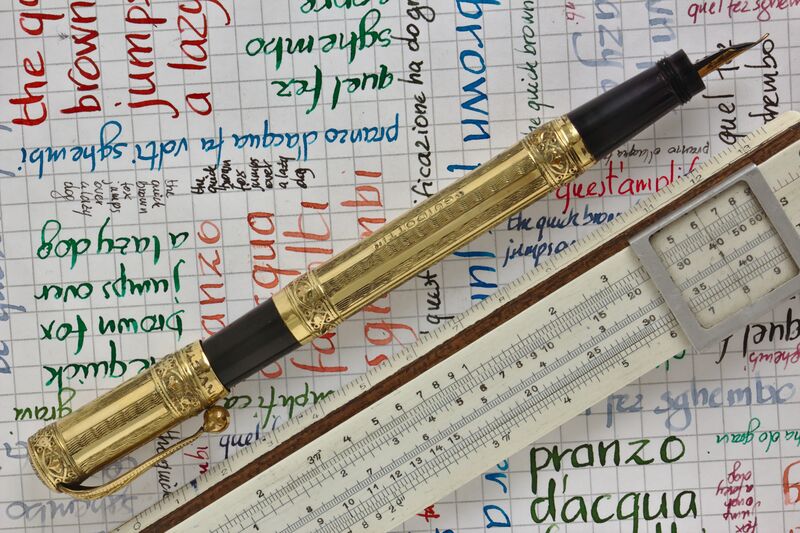 Photo of a pen produced by Invicta. Filling system: safety. With with alternating of waved and smooth panels and chiseled rings gold rolled overlay. "WARRANTED" "14 CT" "1ST QUALITY" nib, gilding marked 18 "K.R." on the cap lip.