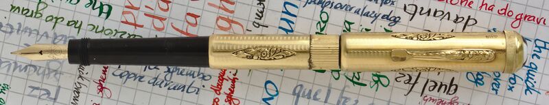 Photo of a pen produced by Astoria. Model: Astoria No. 2. Filling system: safety. With gold rolled overlay. Guilloché decoration with floral motif engraved in flattened eye panels. Enameled logo on cap head.
