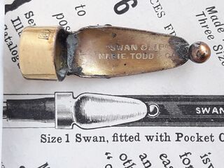 Foto di una penna Swan. Modello: Swan Pen 1500. Caricamento a contagocce. Realizzazione in ebanite. Dettaglio della clip di comodo. Modello con cappuccio a frizione e due bande cesellate in oro massiccio 18k, dotata di Swan Clip. Contributo di Giorgio (utente forum Musicus).