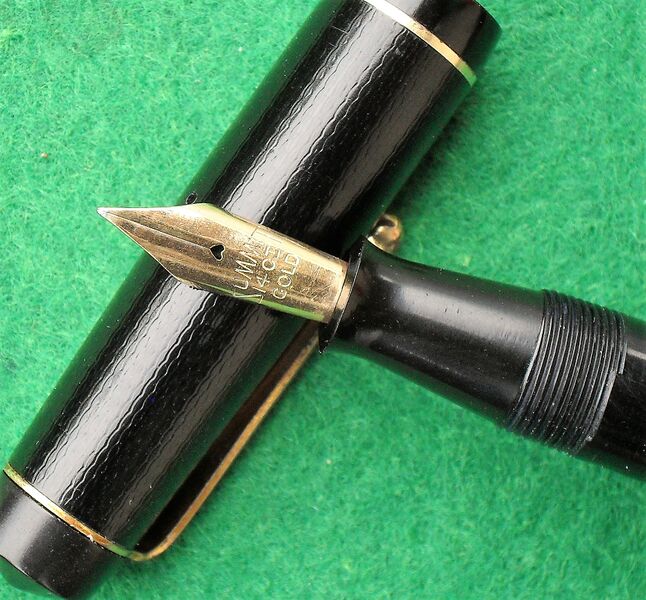 Photo of a pen produced by Summit (a Lang - Curzon - Summit trademark). Model: Summit Robot. Filling system: lever filler. In black chased celluloid. Detail of feeder. Using barrel and cap identical to those of S.125 mk1. With the imprint Unbreakable, referring to celluloid.