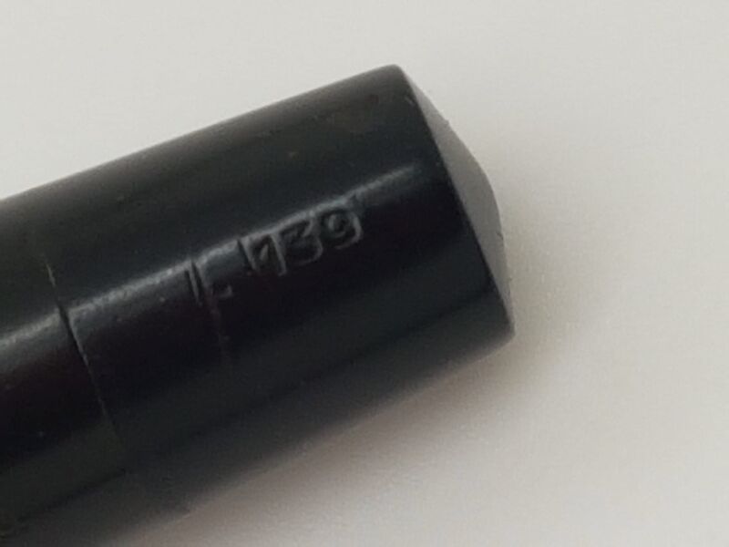 Foto di una penna Montblanc marcata "fabbricata in Germania". Modello: Montblanc 139. Caricamento a stantuffo. Realizzazione in celluloide nera. Dettaglio del fondello. Dettaglio della numerazione. Versione con pennino in acciaio e finestra lunga. Contributo di Fabio (utente forum fountainpen.it fabbale09).