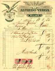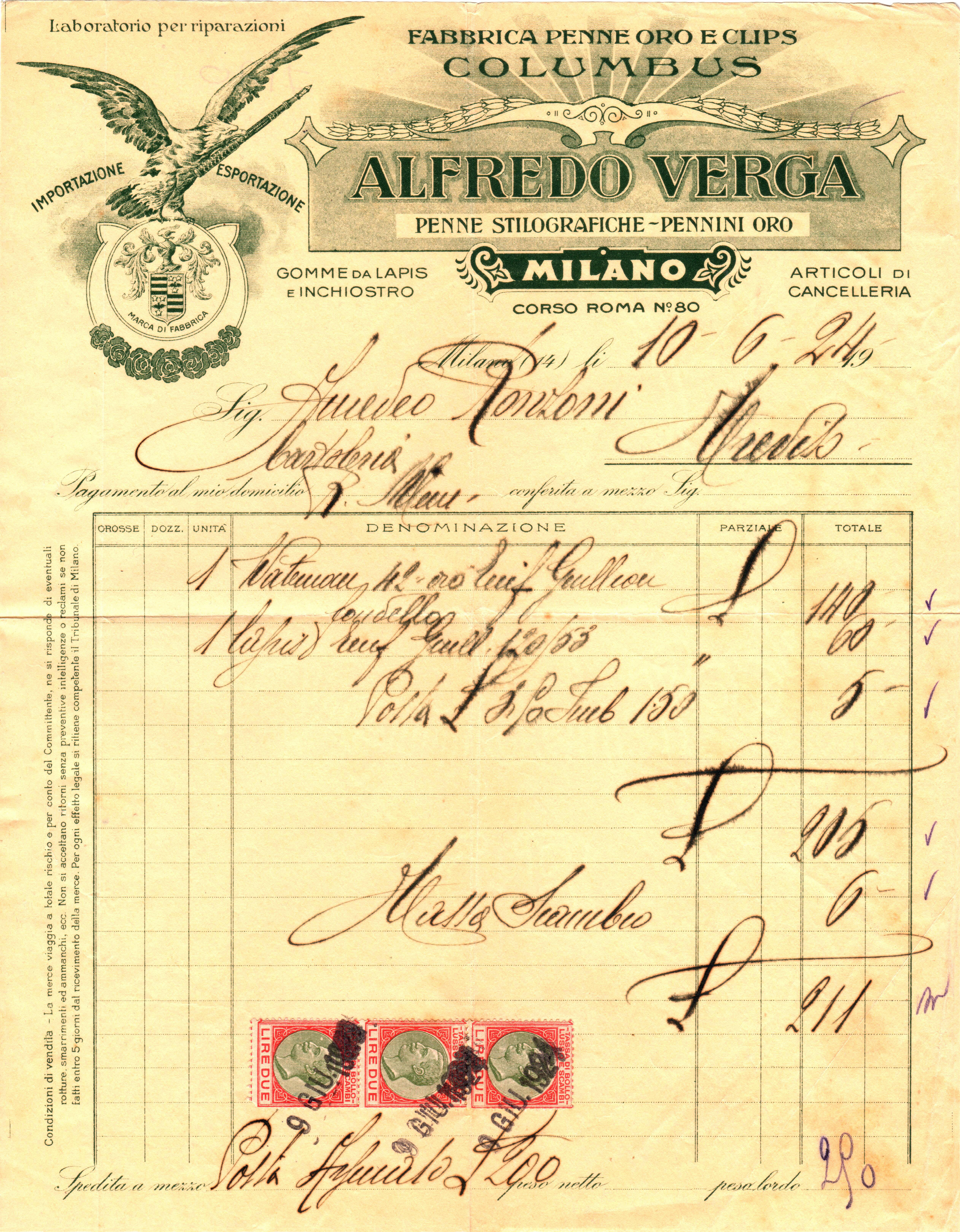 Scanning of an invoice from Columbus dated 1924-06-10. Date directly visible. invoice for repairs (mention the knob of a Waterman 42) of the Alfredo Verga - Fabbrica Penne Stilografiche Columbus before Verga brothers separation. Mention as address: "Corso Roma, 80 Milano".