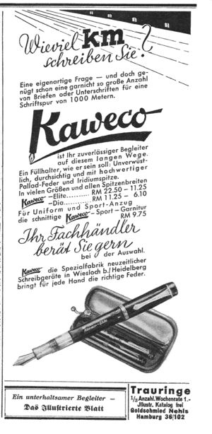 La seconda guerra mondiale causò una forte diminuzione delle materie prime e della manodopera disponibile, fino al 1941 l'azienda mantenne buoni livelli di produzione, ma dal 1943 al 1945 essa cessò quasi completamente. Nel dopoguerra la produzione riprese; le linee Dia ed Elite vennero riproposte in nuove misure, ma con pennino in cromo-nichel, solo il modello di punta, la Carat, che comparve per la prima volta nel catalogo del 1950 con le misure 283, 285, 287 e 290 aveva un pennino oro bicolore. Sempre nel 1950 riprese la produzione del modello Sport, che ottenne un buon successo. Vennero mantenute le linee economiche per studenti Colleg e Kadett; tutte le penne erano prodotte con caricamento a stantuffo.
