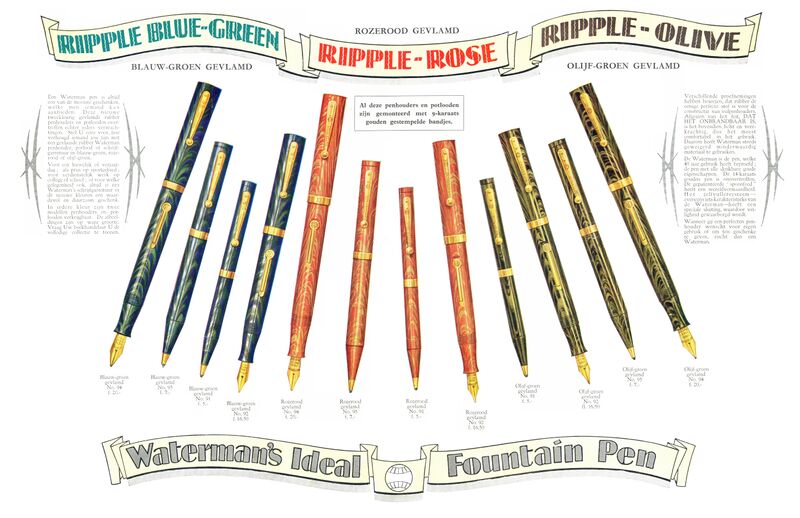 Scanning of advertising from Waterman dated 1928. Retouched by the author for a better sharpness. Guess date, from showed models. Advertising for the new 92 and 94 in coloured hard rubber (olive, rose e blue-green). Internal pages. On the other side of File:192x-Waterman-9x-Rippled-Brochure-p01.jpg. On the other side of File:192x-Waterman-9x-Rippled-Brochure-p04.jpg.