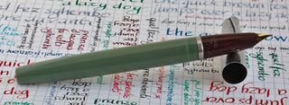 Foto di una penna Aurora. Modello: Duo-Cart. Caricamento a cartuccia. Realizzazione in celluloide. Versione con sezione rossa e fusto grigio/verde.