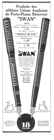 Scansione di una pubblicità Swan datata 1927. Pubblicazione su: L'Illustration. Ritoccata dall'autore per una migliore nitidezza. Data indicativa, ma abbastanza sicura, per la pubblicazione di pubblicità analoghe con gli stessi modelli su L'Illustration nei numeri del 1927-11-12 e del 1927-12-17. Pubblicizza un modello con caricamento a levetta chiamato genericamente Swan Pen ed un modello economico chiamato Merle Blanc, presumibile corrispondente francese dei Blackbird.