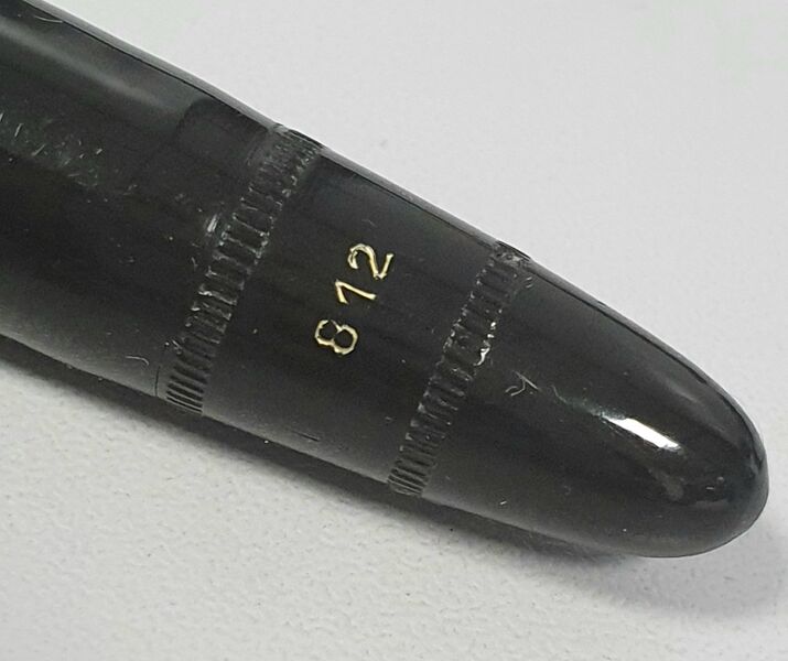 Foto di una penna Montegrappa. Modello: Montegrappa Extra 812. Caricamento a stantuffo. Realizzazione in celluloide nera. Dettaglio del fondello. Dettaglio della numerazione. Versione con marchio MG sul cappuccio. Contributo di Walter (utente forum Wall).