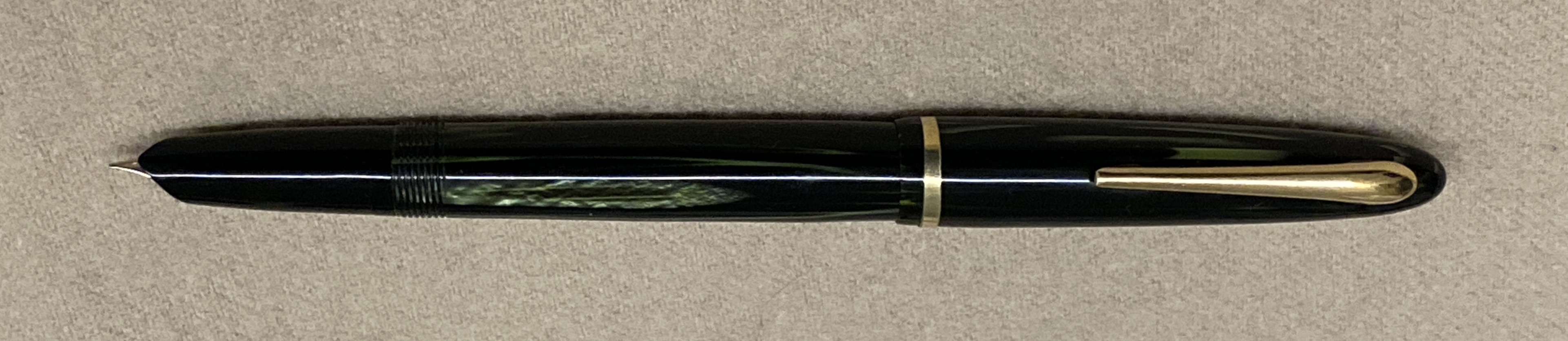 Photo of a pen produced by Tibaldi. Model: Tibaldi 20-L. Filling system: piston filler. In arco green celluloid. Detail of cap. Hooded nib model, marked "D-6373".