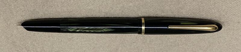 Foto di una penna Tibaldi. Modello: Tibaldi 20-L. Caricamento a stantuffo. Realizzazione in celluloide arco verde. Dettaglio del cappuccio. Modello con pennino coperto, marcata "D-6373". Contributo di Francesco (utente forum francoiacc).