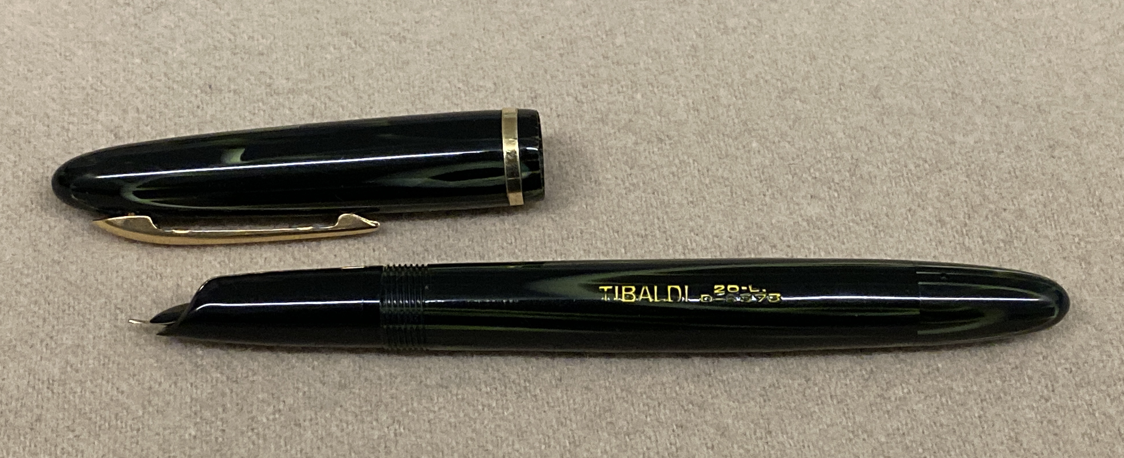 Foto di una penna Tibaldi. Modello: Tibaldi 20-L. Caricamento a stantuffo. Realizzazione in celluloide arco verde. Dettaglio del cappuccio. Modello con pennino coperto, marcata "D-6373". Contributo di Francesco (utente forum francoiacc).