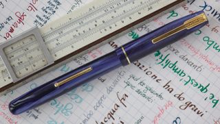 Foto di una penna Waterman. Modello: Dauntless. Caricamento a levetta. Realizzazione in celluloide striata blu. Produzione inglese.