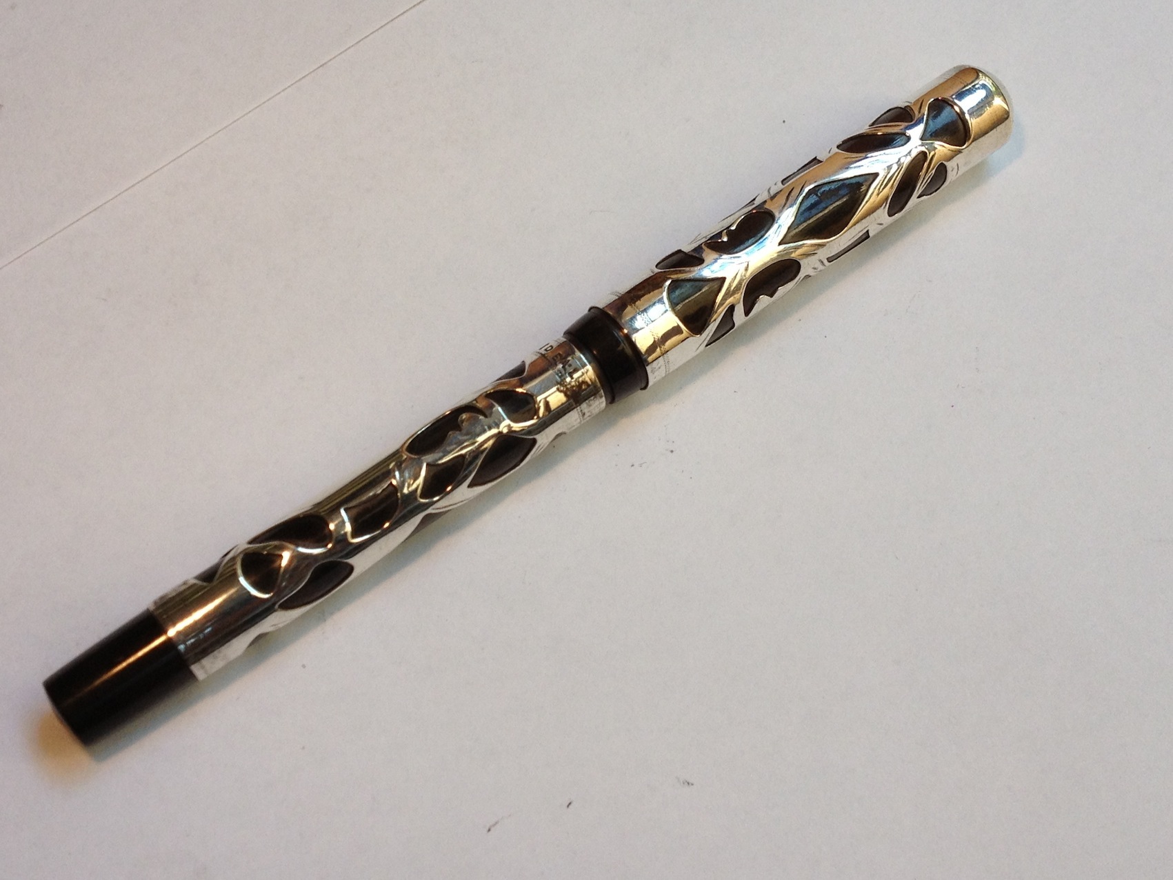 Foto di una penna Waterman. Modello: Waterman 12. Caricamento a contagocce. Realizzazione con rivestimento in argento traforato. Con un raro pennino con stampigliatura a stella. Contributo di Armando Dabbene (utente forum fountainpen.it A Dabbene).