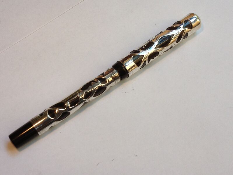 Photo of a pen produced by Waterman. Model: Waterman 12. An eyedropper filler. With openwork sterling silver overlay. With a rare star imprinted nib.