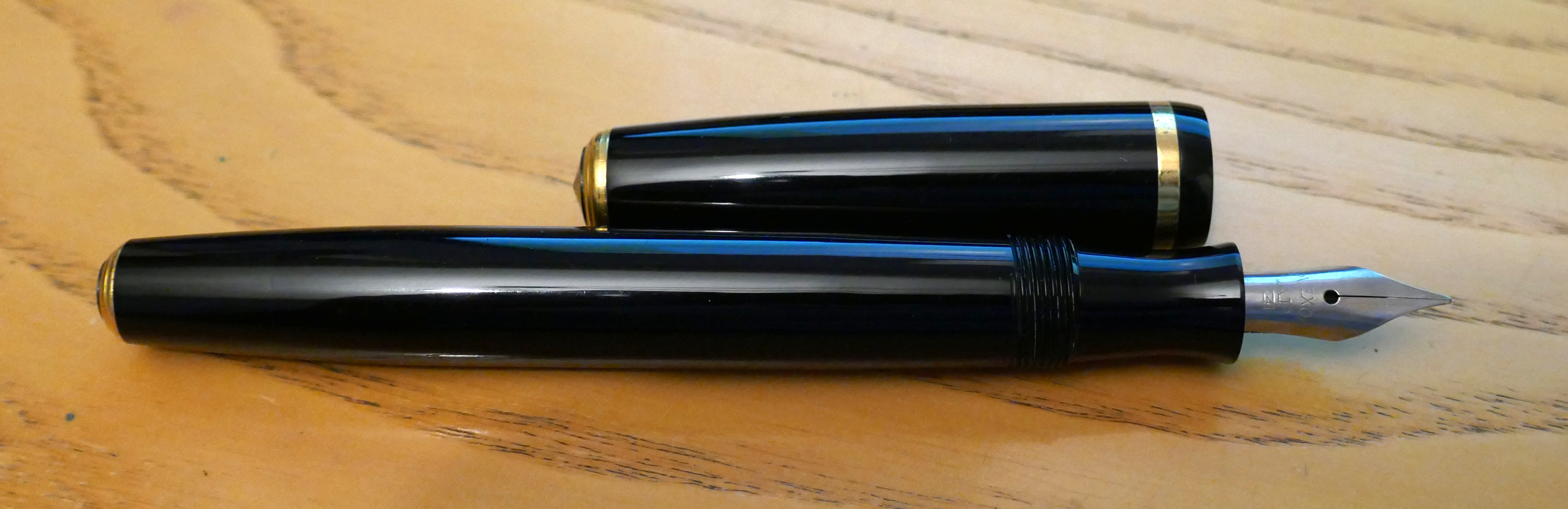 Foto di una penna Plexor. Modello: Plexor 26BL. Caricamento a pulsante di fondo. Realizzazione in celluloide nera. Modello analogo alla Duofold NS. Contributo di Andrea (utente forum bisguillo).
