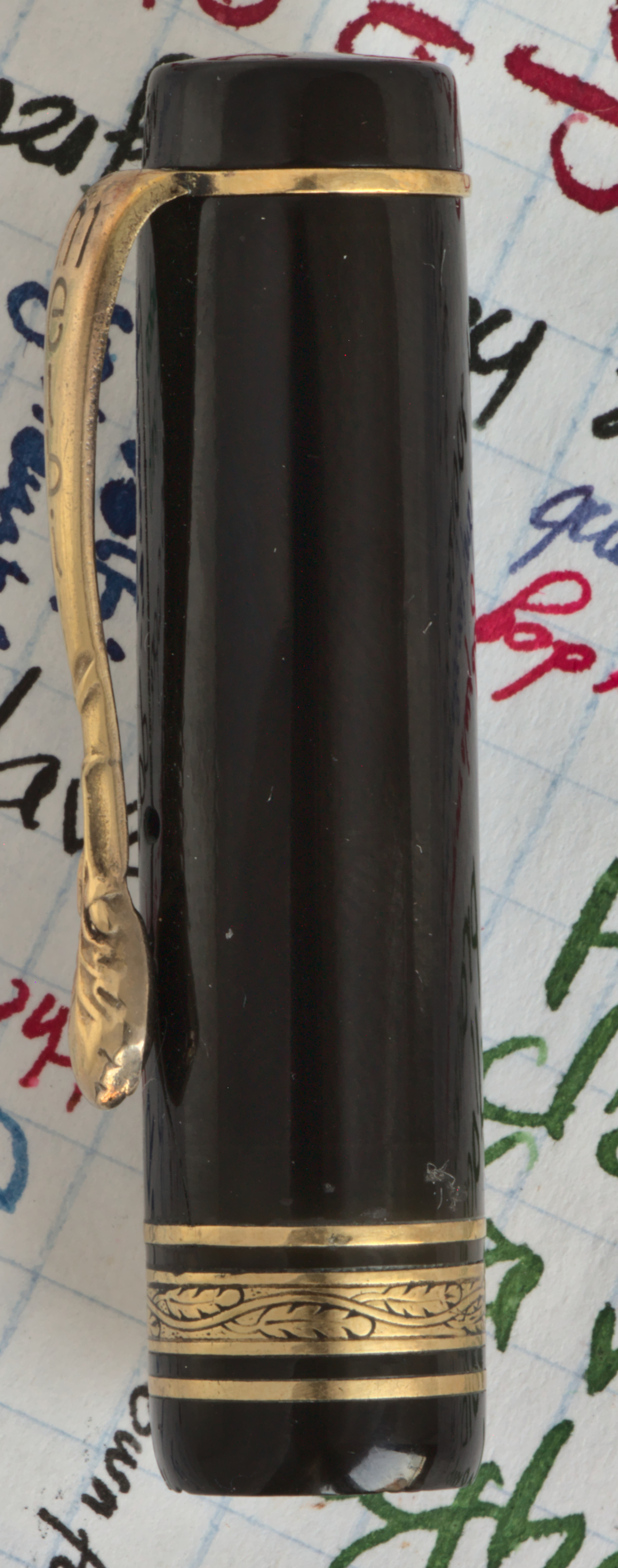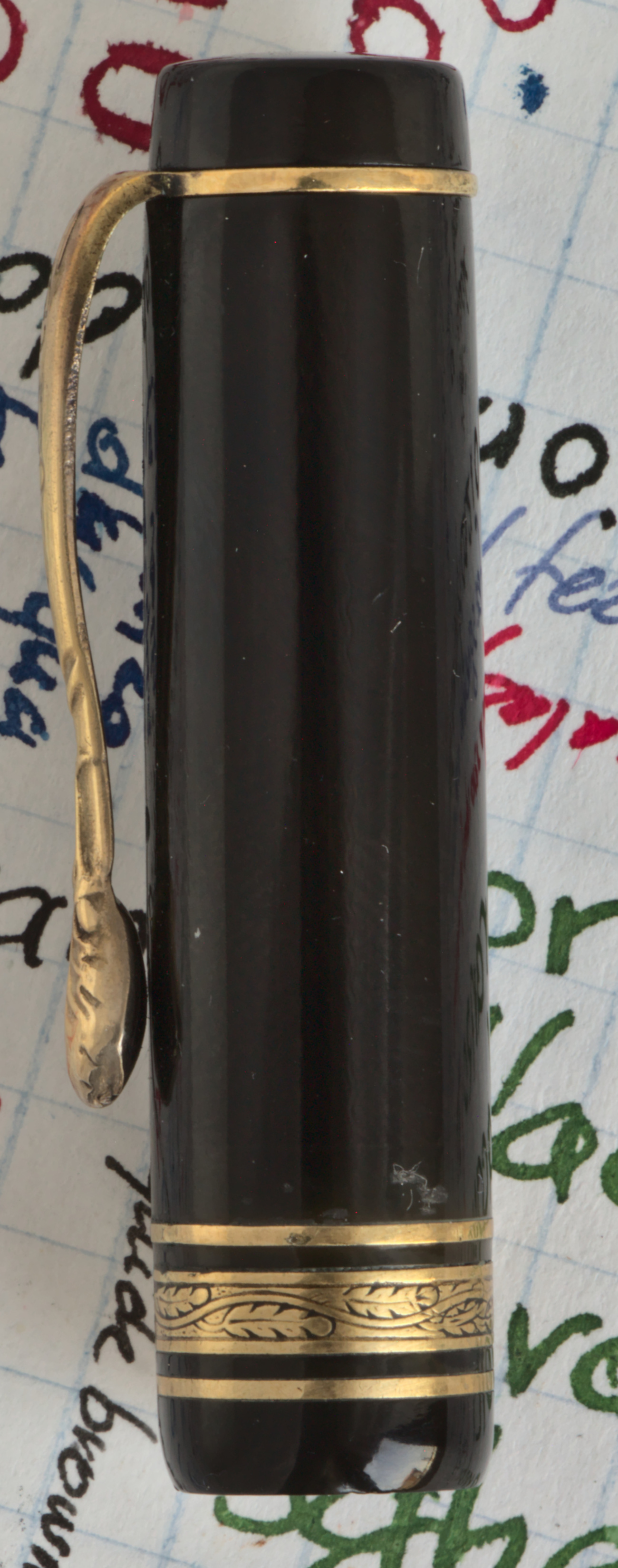 Photo of a pen produced by Melbi. Filling system: button filler. In black celluloid. Detail of cap. Detail of clip. Detail of band. Unknown model, a flat-top with an original clip and band decorated with floral engravings.
