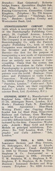 Scansione di una rubrica del 1914. Tratta da: "Whitaker's Red Book of Commerce - Who's Who in Business" (pag. 896), edito da "J. Whitaker and Sons, Ltd.". Concerne le aziende: Stephens. Riporta la voce sulla "Stephens Henrt C.", fondata nel 1832, con sede 57-59, Aldersgate Street, London, E.C. Ripubblicato dal sito di Grace's Guide, originale a questo indirizzo.