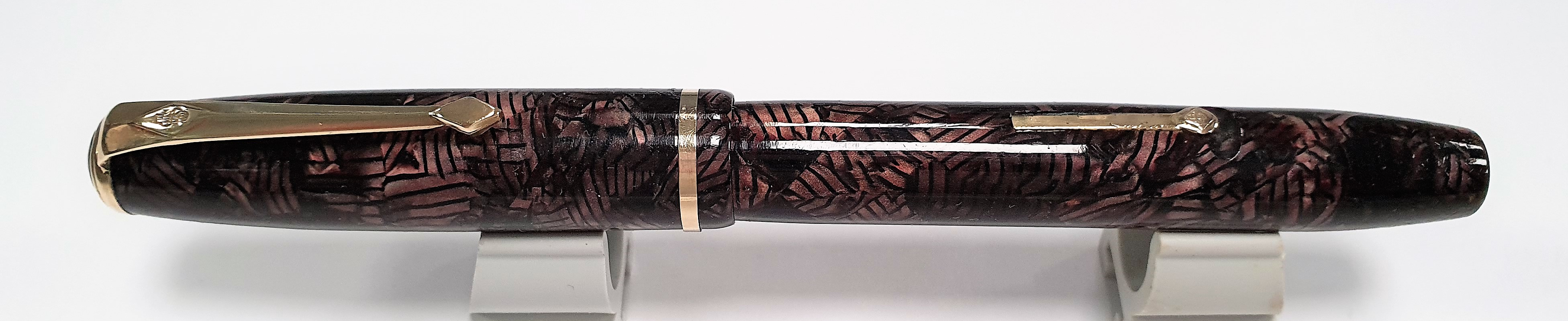 Foto di una penna Conway Stewart. Modello: Conway Stewart 28. Caricamento a levetta. Realizzazione in celluloide tratteggiata borgogna. Versione con la stampigliatura Conway Stewart. Contributo di wall.