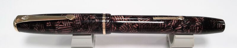 Photo of a pen produced by Conway Stewart. Model: Conway Stewart 28. Filling system: lever filler. In burgundy hatched celluloid. Version with Conway Stewart imprint.